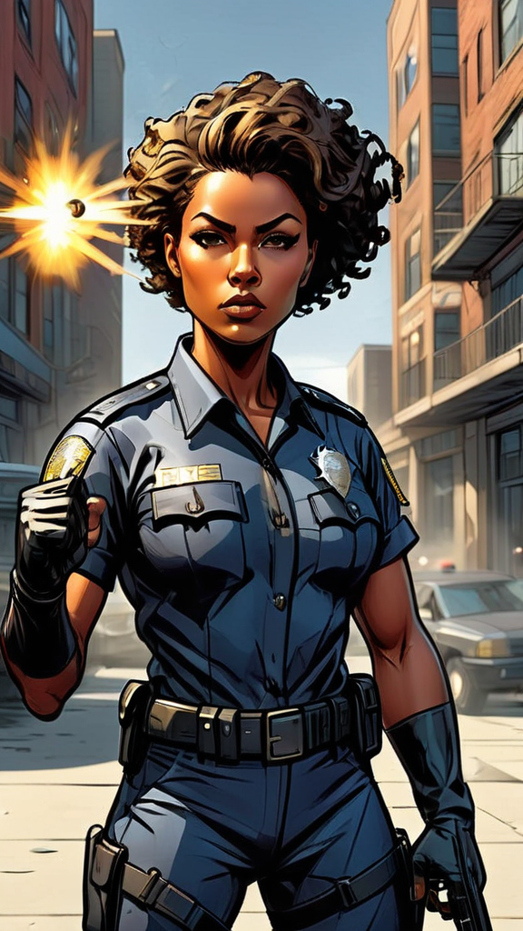 Female cop, lieutenant, streetwise super-hero. African-American female, feminine but tough. Tall, strong, athletic. Curly black short hair, swept back on one side, blonde streaks on the top. Smooth brown skin, Hazel eyes. Beautiful face, moderate make-up. Black police uniform, feminine version. Quick dexterity and fast reflexes--- she can catch a bullet in the air. She is invulnerable to physical damage, bullets bounce off her and fire, electricity, bombs do not effect her. If she does get any physical damage, she can heal herself. She carries a silver automatic pistol, she dies not miss her target. Full body pose, fighting stance. Probably busting up a drug ring.