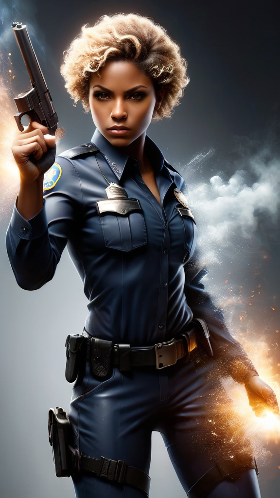 Female cop, lieutenant, streetwise super-hero. African-American female, feminine but tough. Tall, strong, athletic. Curly black short hair, swept back on one side, blonde streaks on the top. Smooth brown skin, Hazel eyes. Beautiful face, moderate make-up. Black police uniform, feminine version. Quick dexterity and fast reflexes--- she can catch a bullet in the air. She is invulnerable to physical damage, bullets bounce off her and fire, electricity, bombs do not effect her. If she does get any physical damage, she can heal herself. She carries a silver automatic pistol, she dies not miss her target. Full body pose, fighting stance. Probably busting up a drug ring.