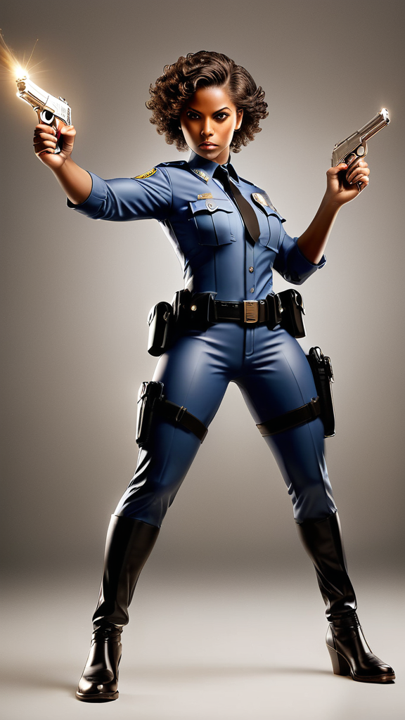 Female cop, lieutenant, streetwise super-hero. African-American female, feminine but tough. Tall, strong, athletic. Curly black short hair, swept back on one side, blonde streaks on the top. Smooth brown skin, Hazel eyes. Beautiful face, moderate make-up. Black police uniform, feminine version. Quick dexterity and fast reflexes--- she can catch a bullet in the air. She is invulnerable to physical damage, bullets bounce off her and fire, electricity, bombs do not effect her. If she does get any physical damage, she can heal herself. She carries a silver automatic pistol, she dies not miss her target. Full body pose, fighting stance. Probably busting up a drug ring.