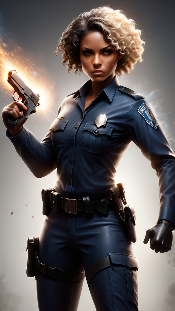 Female cop, lieutenant, streetwise super-hero. African-American female, feminine but tough. Tall, strong, athletic. Curly black short hair, swept back on one side, blonde streaks on the top. Smooth brown skin, Hazel eyes. Beautiful face, moderate make-up. Black police uniform, feminine version. Quick dexterity and fast reflexes--- she can catch a bullet in the air. She is invulnerable to physical damage, bullets bounce off her and fire, electricity, bombs do not effect her. If she does get any physical damage, she can heal herself. She carries a silver automatic pistol, she dies not miss her target. Full body pose, fighting stance. Probably busting up a drug ring.