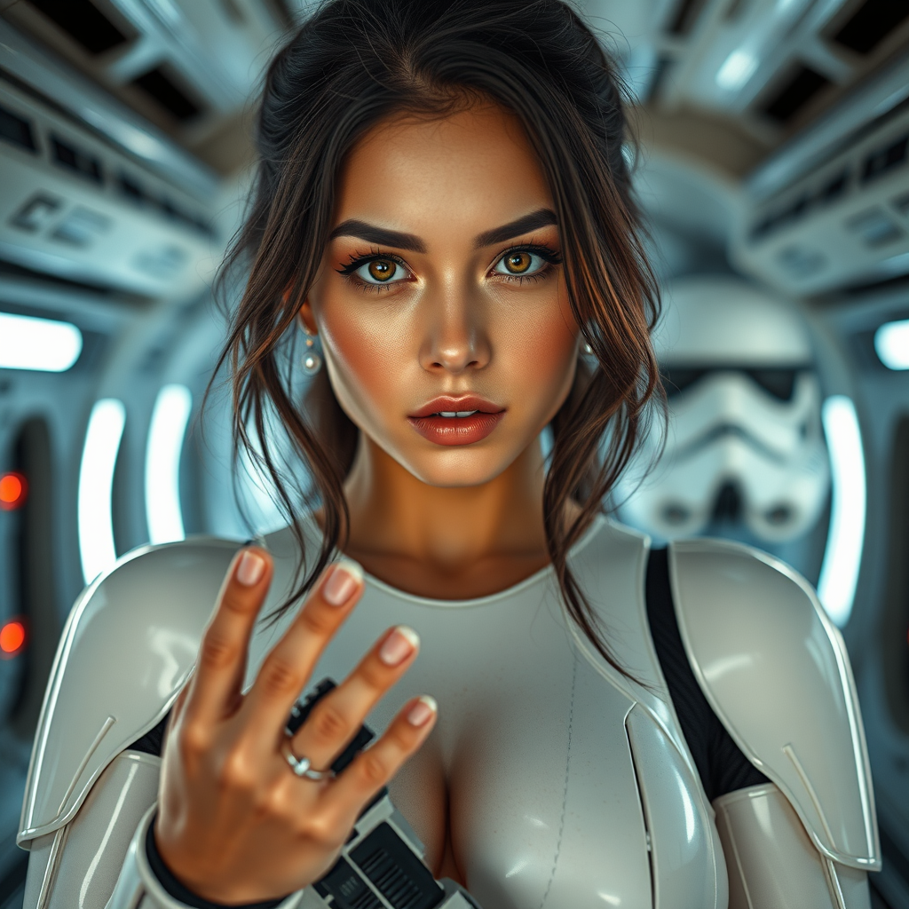 Female cosplay as stormtrooper, intimate attire, starship setting, engaging viewer, close-up photography, detailed complexion, ultra-realistic, high-definition, comprehensive detail, full-body capture, enhanced RAW color artistry, facial piercings, soft diffused lighting, minimal depth of field, precise focus, cinematic lighting, visual imperfections, pixelation, cropped image, subpar quality, compression artifacts, unattractive, redundant, distorted, cut-off, excessive digits, altered hands, distorted features, imbalanced anatomy, disproportionate limbs, duplicated visage, abnormal proportions, malformed extremities, omitted arms or legs, extra appendages, fused or excessive fingers, elongated neck, digital overlays.