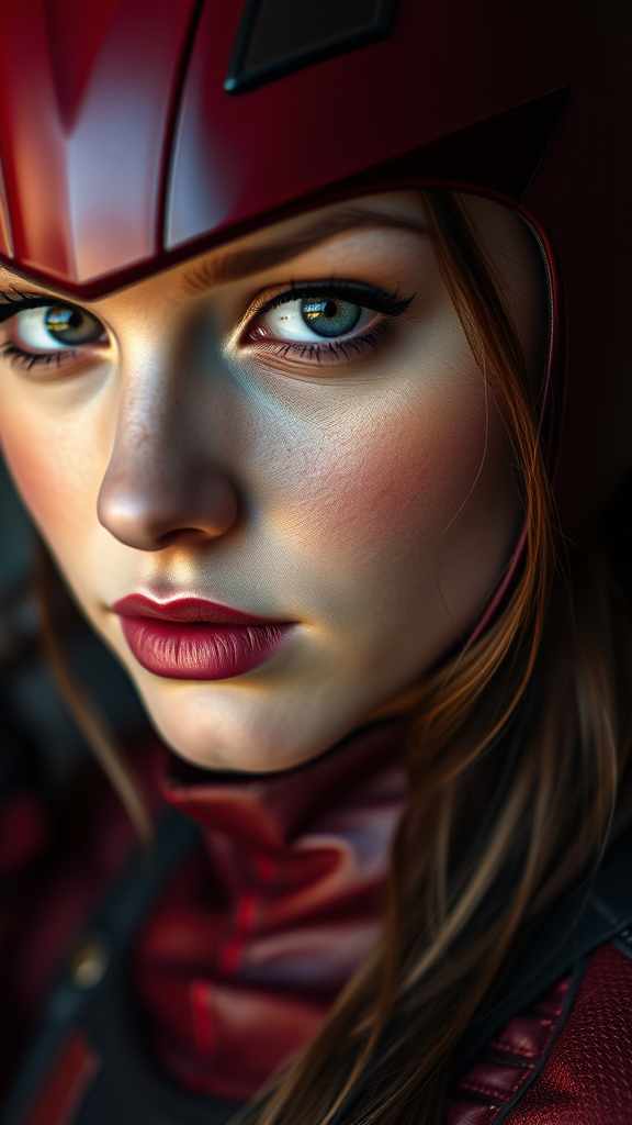 Female cosplaying as Daredevil, gazing directly at the viewer, captivating portrait in a photographic style, showcasing detailed skin with a realistic, photo-realistic touch in ultra-high definition 8k. The composition is richly detailed, capturing a full-length frame with high-detail RAW color art. Her look includes a piercing, with skillfully diffused soft lighting creating a shallow depth of field and sharp focus. The scene is set with hyperrealism and cinematic lighting, ensuring clarity and depth. The focus remains on quality, avoiding low resolution, text errors, or cropping mishaps. The image maintains high standards, steering clear of JPEG artifacts, duplicates, and any deformities or anatomical inaccuracies, ensuring no gross proportions or disfigurements. The portrayal remains elegant without extra limbs or unnatural features, preserving an authentic depiction in both form and setting.