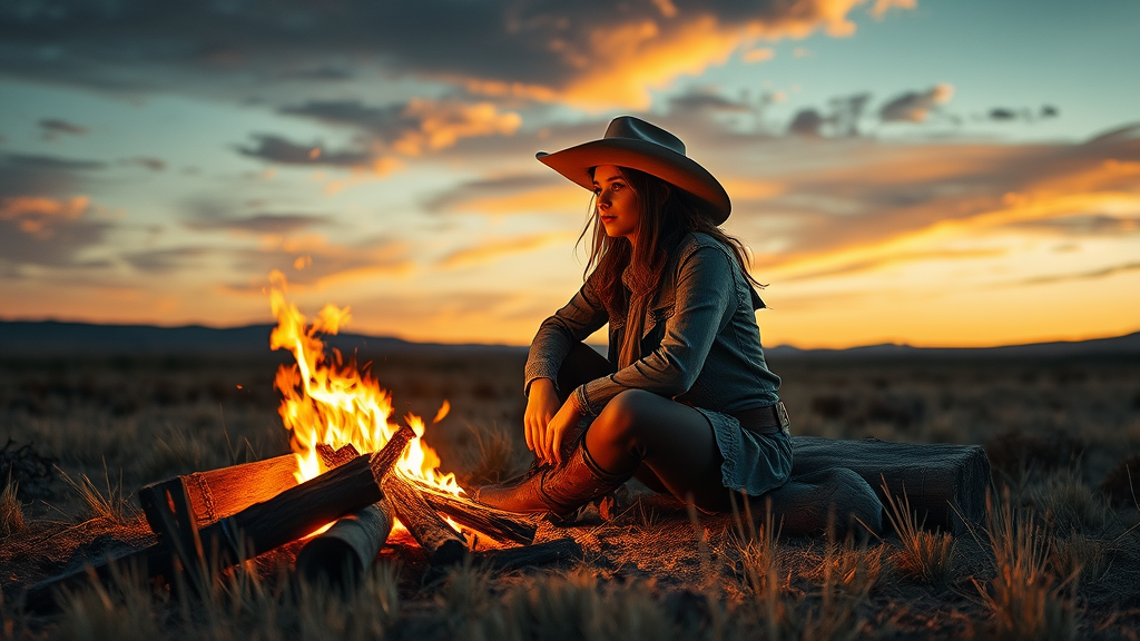 female cowboy resting by a warm campfire under the open prairie sky, surrounded by western landscapes, portrayed in a key visual with highly detailed and breathtaking beauty; composed in a comprehensive cinematic style with best quality and ultra-sharp focus; set in the vast borderlands with elements of rugged charm; avoiding imperfections such as missing or extra limbs, disfigurations, or poorly executed anatomy; ensuring no out-of-frame elements, tiling, or blurred aspects; free from unwanted artifacts, text, or signatures.