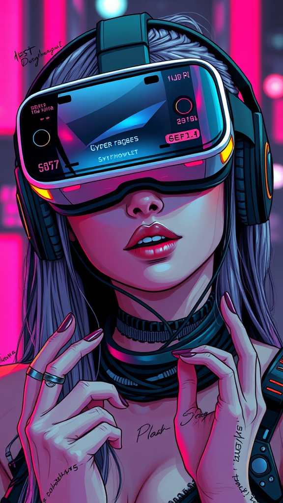 Female cyberpunk avatar with VR headset, 4k resolution, highly detailed, with a synthwave aesthetic incorporating text and visual errors; features might include missing or extra fingers, cropped elements with potential low-res and JPEG artifacts. Mutations like disfigured appendages, poorly drawn anatomy, and out-of-frame characteristics may appear. Expect possible tiling, deformations, and blurriness with occasional watermarks or signatures, leading to a unique and intriguing visual blend.