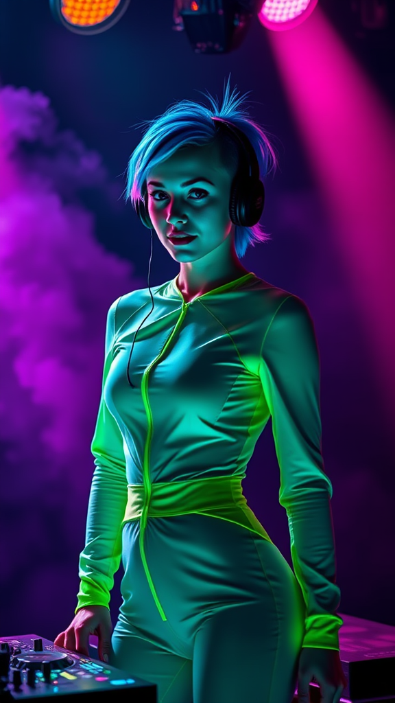 Female DJ, 25, androgynous lean physique, electric blue hair with pink tips, diminutive ponytail fauxhawk hairstyle, sleek black over-ear headphones, enigmatic smile, standing on a darkened stage, dressed in futuristic neon-green jumpsuit, surrounded by pulsating LED lights, set against a backdrop of swirling mist, 12bit color depth, array of vibrant colors, subtle texture overlay, moody, high contrast, atmospheric lighting, muted film grain, overexposed highlights, considered color grading, crystalline clarity, high detail.