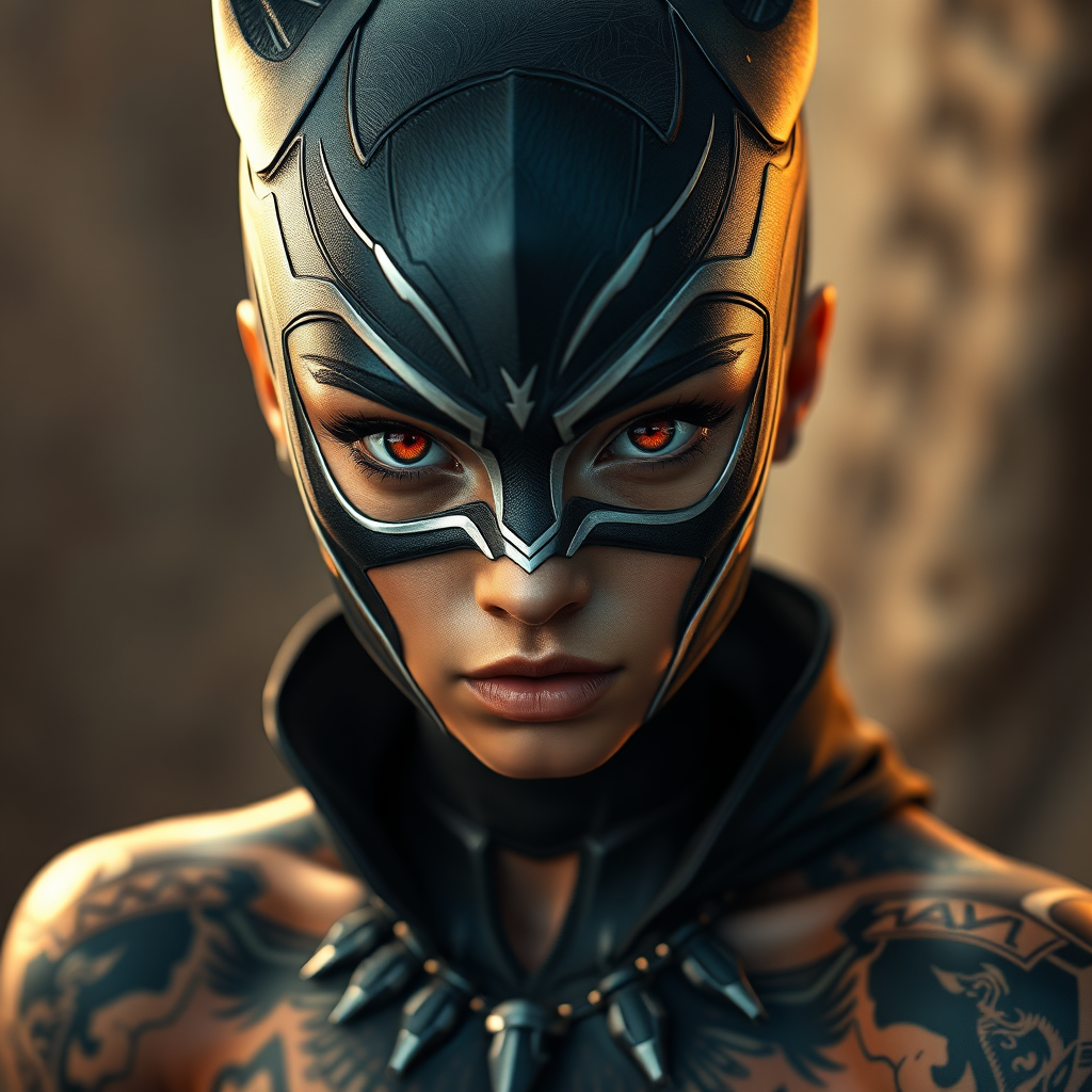 Female dressed as Black Panther, adorned with intricate tattoos, directly engaging the viewer, portrait-style photography capturing detailed skin tones, 8k resolution, exhibiting high detail and color richness, full body depiction. Features include piercing eyes, diffused soft lighting, a shallow depth of field, sharp focus with hyperrealistic detail, and cinematic 3D lighting. Inspiration from cartoon and anime art elements. The depiction avoids overly stylized anatomy, instead favoring realistic imperfections such as skin spots and blemishes, embodying a young, athletic female with captivating red eyes and a muscular build.