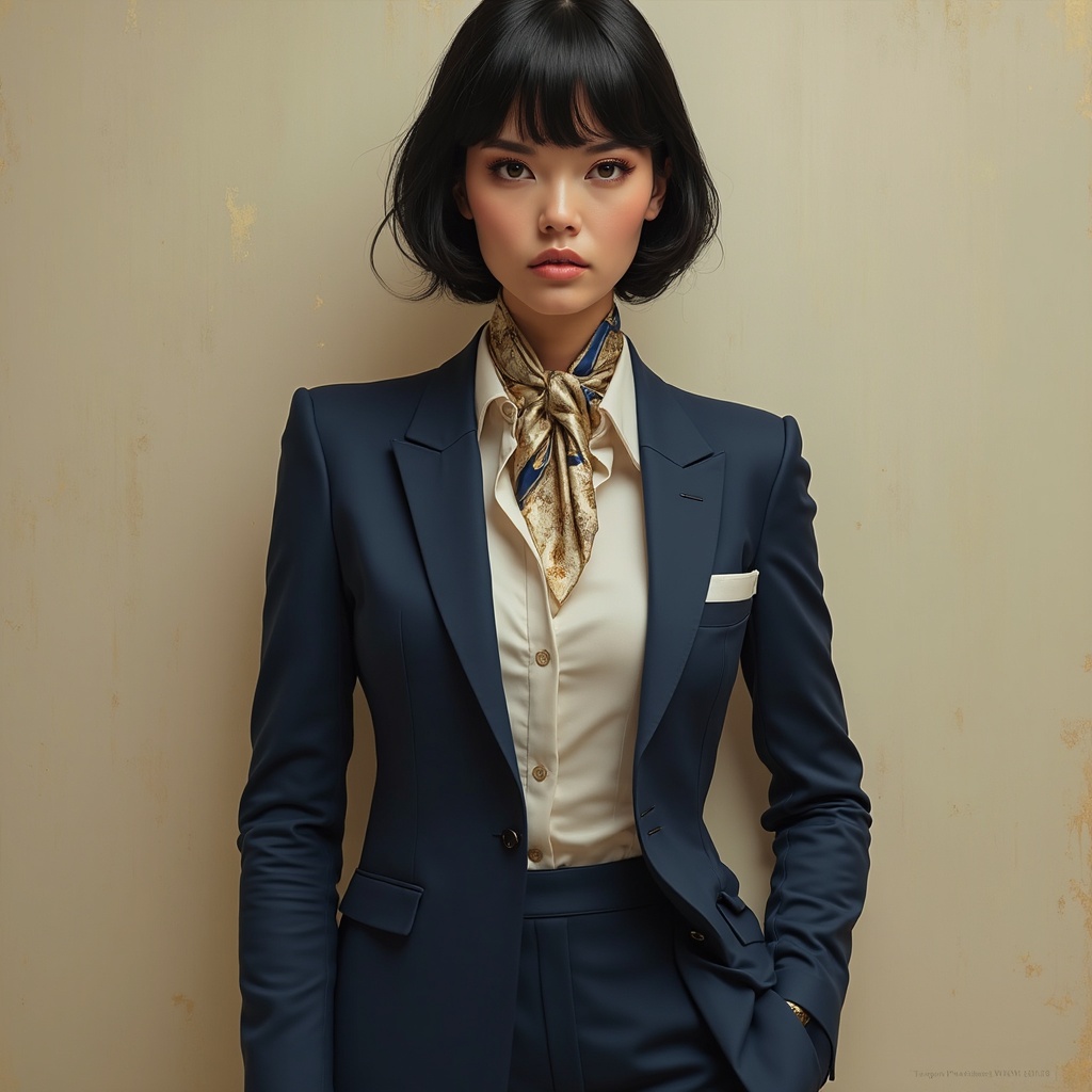 The quintessential female executive embodies authority and elegance. She stands with poise in a perfectly tailored navy blue pantsuit paired with a pristine white blouse, accentuated by a rich silk scarf elegantly draped around her neck. Her glossy, jet-black hair is styled in a precise bun, complementing her striking features and intense gaze. The hyper-realistic artwork captures every nuance of her expression, reflecting determination and intelligence. The high-resolution image reveals the intricate stitching of her suit, the softness of the silk scarf, and the shine of her patent leather shoes. The art style is hyper-maximalist, fusing Art Deco and Art Nouveau elements with a modern flair. Gold leaf and metallic accents enhance the artwork's depth, showcasing meticulous attention to detail. This pioneering piece evokes admiration with its unique portrayal of a strong female figure. It is a breathtaking, epic masterpiece that encapsulates the essence of contemporary femininity and empowerment.