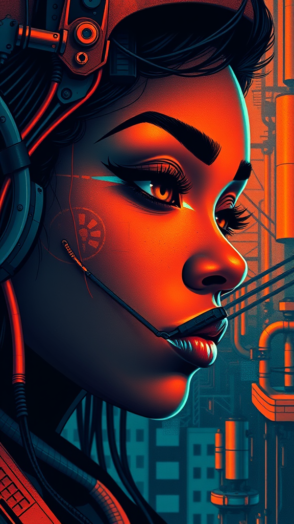 Female face, inspired by afrofuturism, in the style of George Callaghan, blending engineering/construction and design elements, poster art capturing vibrant urban life, infused with dark cyan and orange tones, ultra-high-definition, with a cinematic 1:2 aspect ratio and an artistic flair, creating an evocative and stylized depiction.