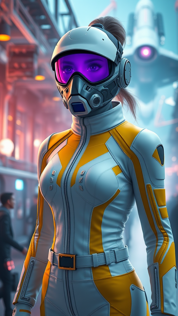 female in a sleek white and yellow jumpsuit with intricate detailing, set in a bustling spaceport, a ship ascending in the backdrop, wearing a mask with a luminous purple sci-fi visor, featuring advanced sci-fi lenses and respirator, trending on artstation, exceptional detail, cinematic masterpiece, awe-inspiring environment, polished, smooth, surreal, ethereal, celestial, with a touch of manga and anime influence, rich atmospheric setting, vivid and intricate color palette, cinematic lighting, hyperrealistic focus, inspired by unreal engine 5 with lumen reflections, cgi elements, 3d artistry, reminiscent of a sculpted doll, rendered with octane, avoiding low resolution, error-free, cropped, worst quality, jpeg artifacts, avoiding duplicates, maintaining anatomical accuracy, retaining optimal proportions, avoiding disfigurement, ensuring clarity, well-hydrated, well-proportioned, consistent limb count, accurate facial portrayal.