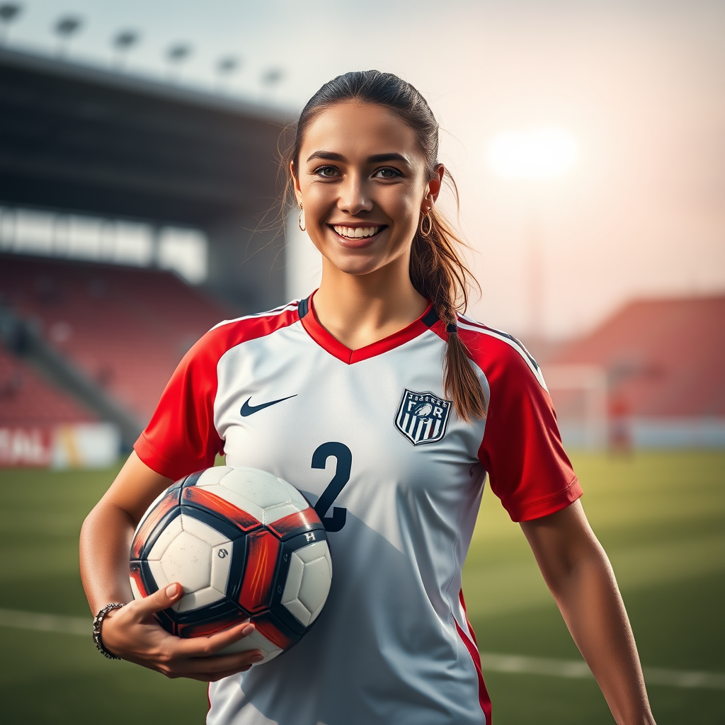 female in soccer uniform, holding soccer ball, smiling confidently, sport field backdrop, making eye contact, portrait shot, high-res photography, detailed complexion, realism, immersive detail, full-length view, vivid RAW color image, jewelry accessory, gentle soft lighting, subtle depth of field, crisp focus, authentic hyperrealism, cinematic light quality, character-centric, minimal distractions, natural proportions, maintaining form, maintaining clarity, visually appealing composition.