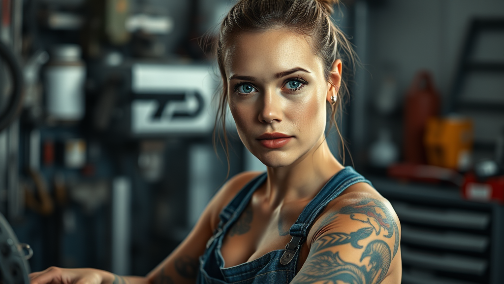 Female mechanic working in a garage setting, wearing jeans with visible tattoos, her face captured clearly as she looks at the viewer. The image is a portrait-style photograph with photorealistic quality, showcasing highly detailed skin and features in an 8k resolution. The environment is highlighted with diffused soft lighting and a shallow depth of field, enhancing sharp focus and cinematic appeal. The composition emphasizes hyperrealism, avoiding text, errors, or unnecessary artifacts. It maintains a balanced portrayal with correct anatomy, proportions, and an unobstructed view of the subject, ensuring nothing appears out of place or distorted.