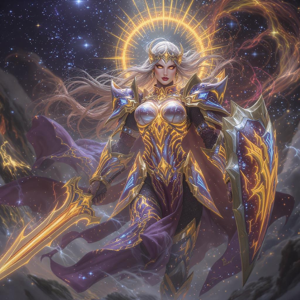A powerful female paladin adorned in glowing, intricate radiant armor, set against a backdrop of fantasy wonder. Her armor is a masterpiece of craftsmanship, with detailed etchings and celestial motifs that shimmer like a supernova. The scene captures her full body in dynamic motion, emphasizing her strength and grace. Volumetric lighting bathes her in a heavenly glow, creating an ethereal aura around her. The atmosphere is charged with energy, as if she stands at the threshold of cosmic forces. Her eyes are fierce yet compassionate, embodying the noble spirit of a true guardian. The aspect ratio highlights her imposing figure and the breathtaking detail of her radiant attire.