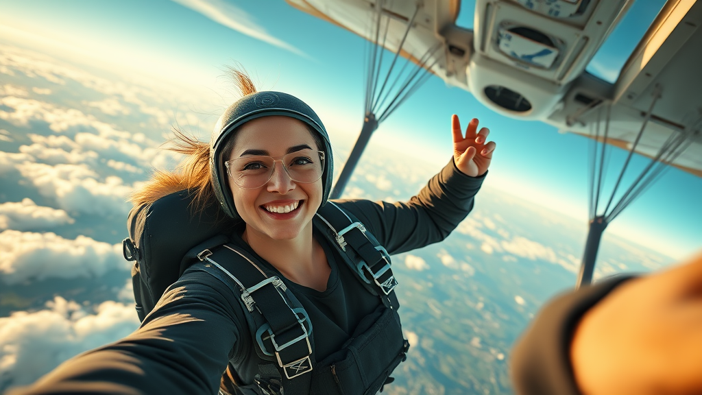Female parachutist leaping from an aircraft with a beaming smile, capturing a selfie during her jump; her full body is visible in the frame with exceptional detail, showcasing realistic and photo-realistic skin texture. The scene is rendered in 8k resolution with high detail in raw color art, featuring diffused soft lighting and a shallow depth of field. The image exhibits sharp focus with hyperrealism and cinematic lighting. CGI-enhanced, the composition is free from low quality, errors, cropping issues, or digital artifacts, ensuring no presence of duplicates, distortions, or anatomical inaccuracies. Everything is proportionate, with limbs and facial features depicted accurately, avoiding any malformed or extra appendages. The image excludes any text, user-generated content, or watermarks.