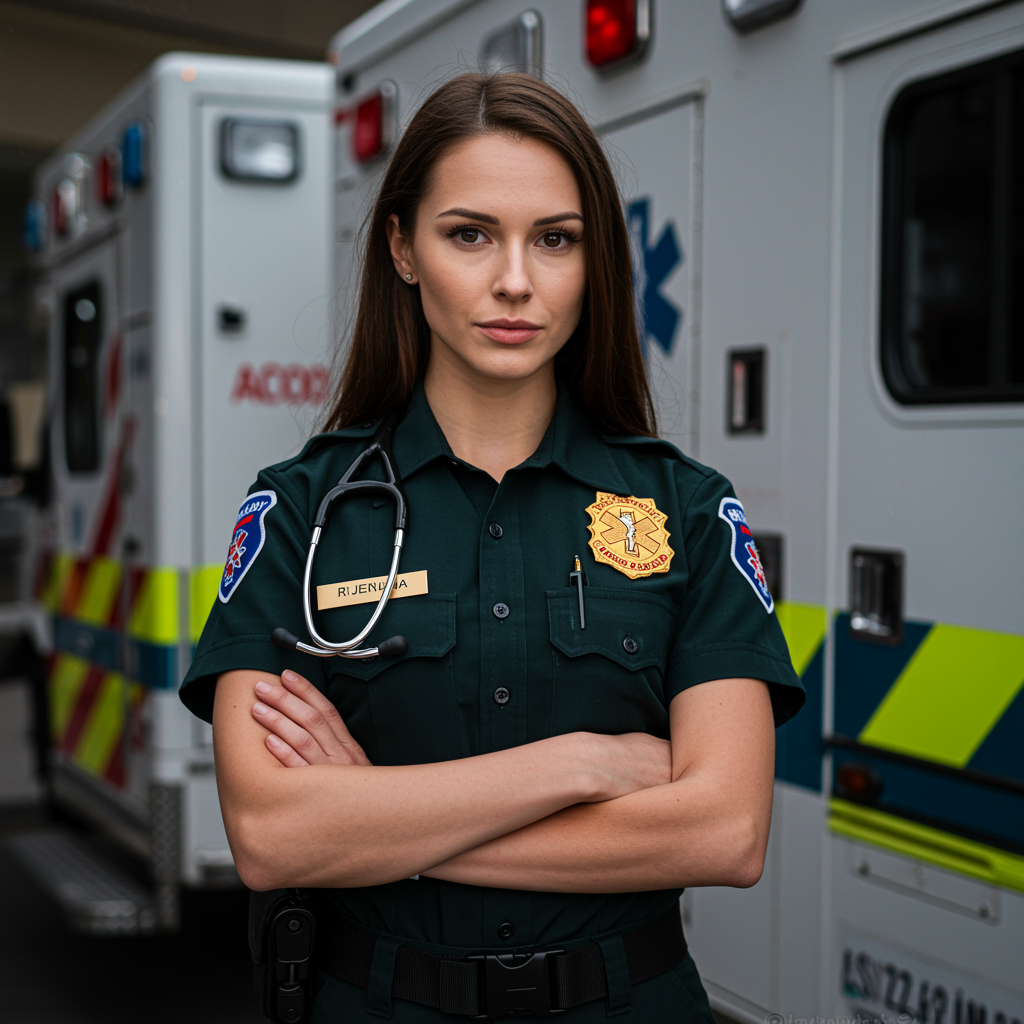 Female paramedic in uniform, stunning, engaging, charming, ambulance in the scene, making eye contact with the viewer, detailed portrait, high-resolution photography, realistic texture, photo-realistic quality, 8k clarity, exceptionally detailed, full-body view, RAW color art with high detail, elegant lighting, soft and diffused, shallow depth of field, precision-focused, hyper-realistic with cinematic lighting, framed low-resolution, with textural and visual errors, cropped composition, inferior quality, artifact presence, unaesthetic, mirrored, grim, distorted, out-of-frame elements, excessive digits, altered hands, ill-defined features, anatomical mistakes, disproportionate anatomy, surplus limbs, repeated facial features, distorted form, imbalanced proportions, malformed limbs, absent arms, absent legs, additional appendages, fused fingers, excessive digits, elongated neck, presence of username, watermark, signatory elements.