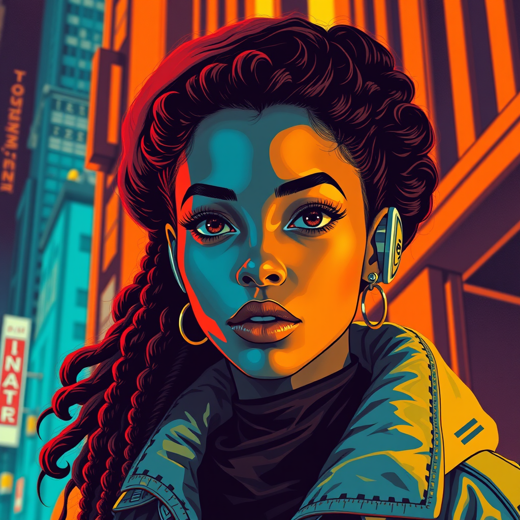 female portrait, afrofuturism style, influenced by george callaghan, blending elements of engineering and architectural design, vibrant poster art showcasing urban lifestyle, dominant dark cyan and orange tones, ultra-high definition detail, vertical composition, imaginative and stylized interpretation with futurist flair
