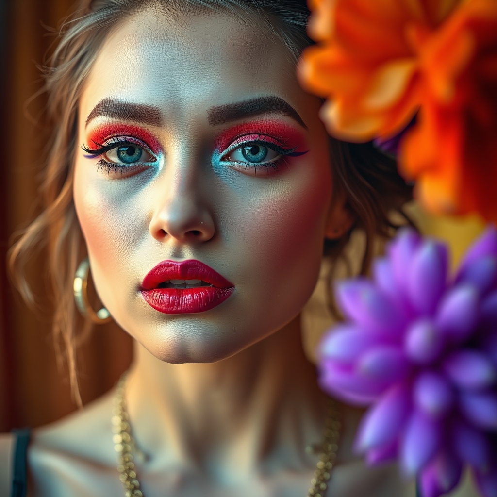 Female portrait featuring bold and bright makeup with vibrant eyeshadow and striking lips, showcasing creative and artistic designs; captures the essence of expressive beauty and allure; composition follows rule of thirds to create visual interest; artistic setting with an emphasis on strong contrasts and vivid colors; imaginative and slightly chaotic elements add to the unique character and intrigue of the scene.