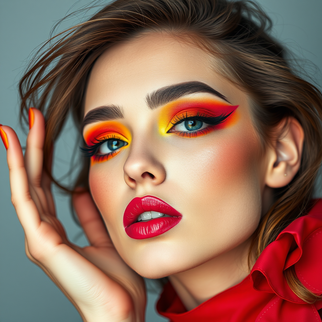 Female portrait featuring bold and bright makeup with vivid eyeshadows and daring lip colors, enhanced by imaginative designs. Emphasize striking contrasts and balance using the rule of thirds, capturing the essence of creativity through expressive and unconventional elements in the composition.