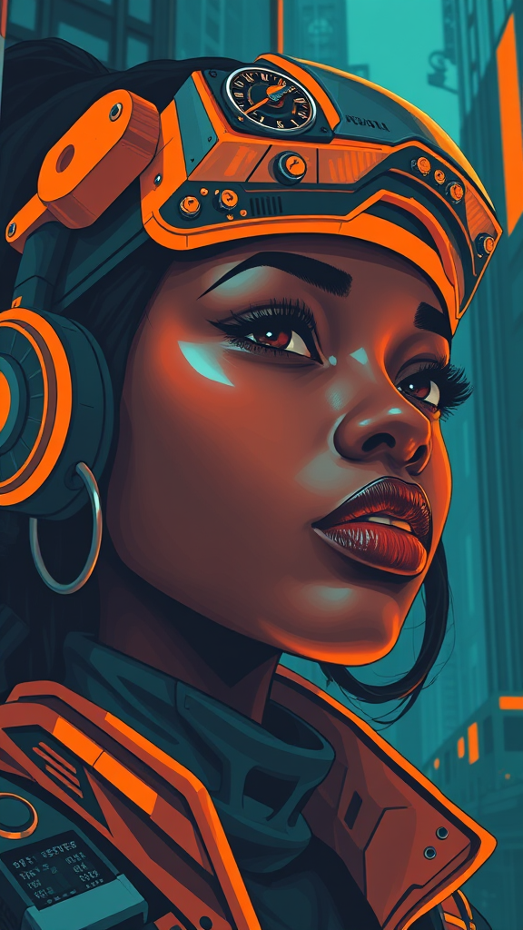 Female portrait in afrofuturism style, inspired by george callaghan, combining engineering, construction, and modern design elements, poster art aesthetic, representation of urban life, with dark cyan and vibrant orange tones, ultra-high definition detail, aspect ratio 1:2, high stylization level.