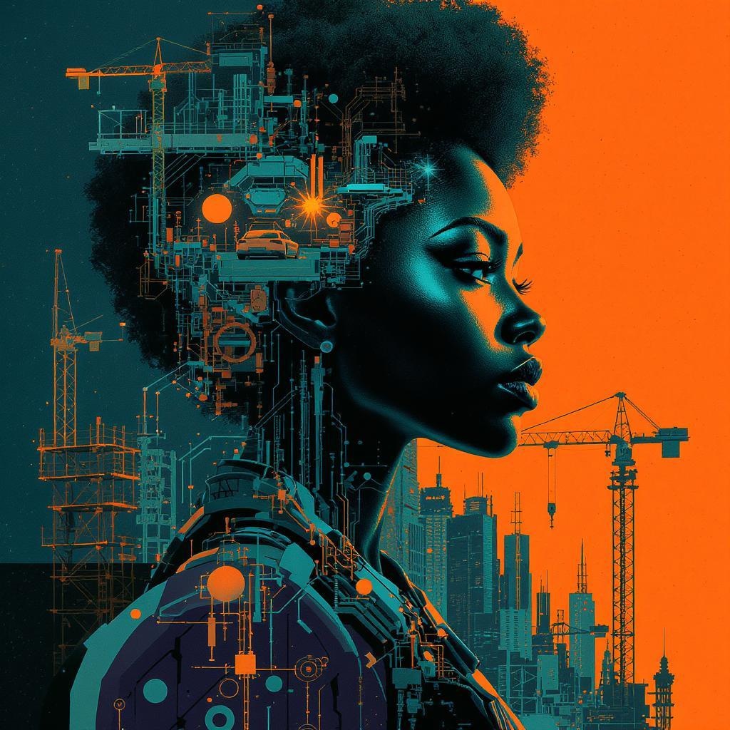 Female portrait in afrofuturism style, inspired by George Callaghan, featuring elements of engineering, construction, and design. Urban life scenes integrated into poster art, utilizing a palette of dark cyan and vibrant orange, capturing a 32k ultra-high-definition quality. Aspect ratio 1:2 with a stylized approach, evoking future innovation and cultural richness.