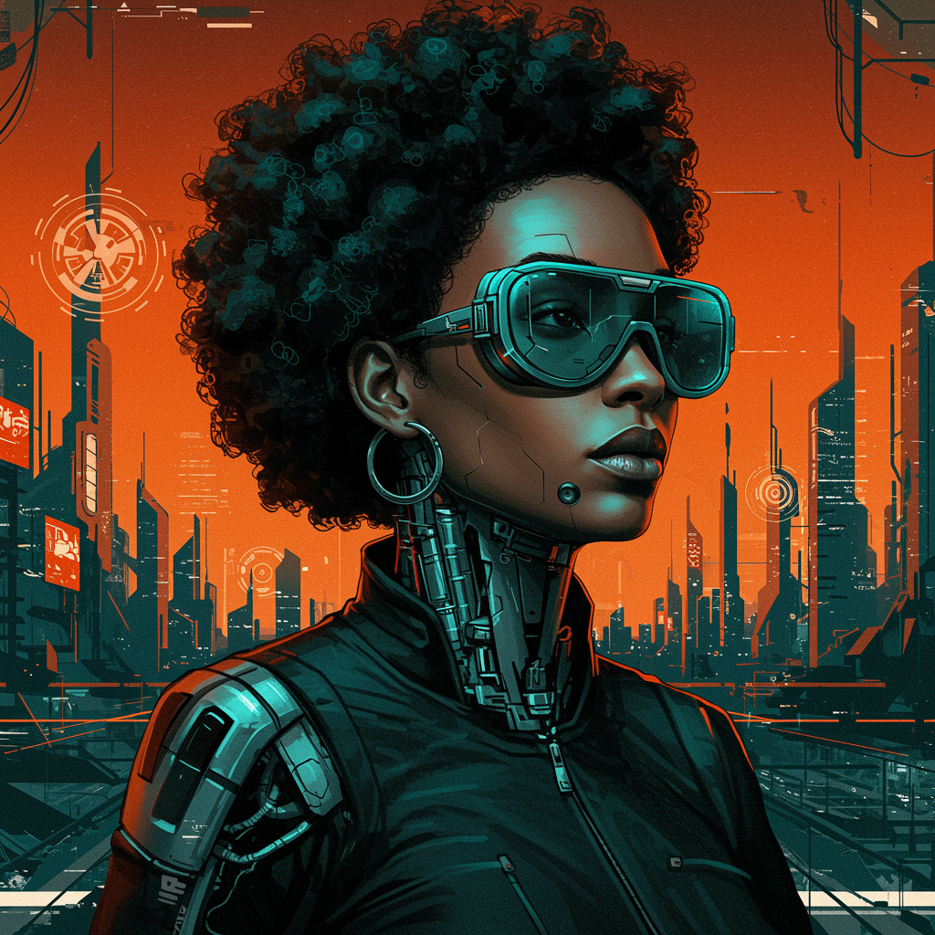 Female portrait in the style of afrofuturism and George Callaghan, incorporating elements of engineering and design, set against a backdrop of futuristic urban life. The color palette features contrasting dark cyan and vibrant orange, with a focus on poster art aesthetics. The imagery showcases a harmonious blend of technological motifs and architectural elements, creating a visionary scene that reflects innovation and creativity. The composition emphasizes dynamic shapes and intricate details, capturing the essence of a forward-thinking metropolis in high definition with a 32k resolution, maintaining a stylized artistic approach.