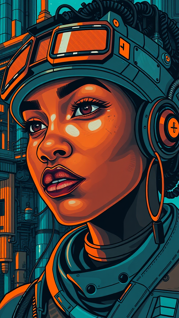 Female portrait, infused with afrofuturism, inspired by George Callaghan, blending elements of engineering, construction, and design, poster art style, portraying vibrant urban life, emphasizing a dark cyan and orange palette, ultra-high-definition, aspect ratio 1:2, with heightened stylization and visionary flair.