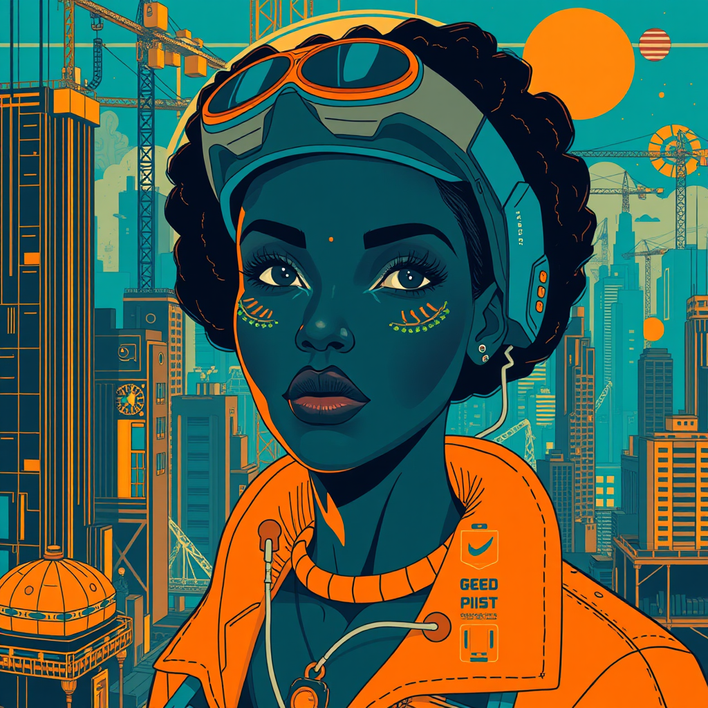 Female portrait inspired by Afrofuturism, blending elements of George Callaghan’s style with themes of engineering, construction, and design. Captures dynamic urban life with a harmonious color palette of dark cyan and orange. Completed in poster art style, featuring intricate architectural motifs and futuristic cityscapes in the background, providing a vision of innovation and cultural resilience in 32k UHD resolution. Aspect ratio set to 1:2 with a stylized artistic touch to emphasize bold creativity and forward-thinking vision.