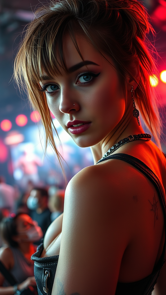 Female rockstar, concert setting in background, engaging viewer, highly detailed portrait, lifelike photography with intricate skin textures, ultra-realistic, 8k resolution, full-length composition, vibrant RAW color art, edgy piercings, soft and diffused lighting, shallow depth of field, crisp focus, hyper-realistic style, cinematic lighting, 3D effect, avoiding low quality aspects like blurriness or distortions, maintaining realistic anatomy and proportions, free of digital errors or artifacts.