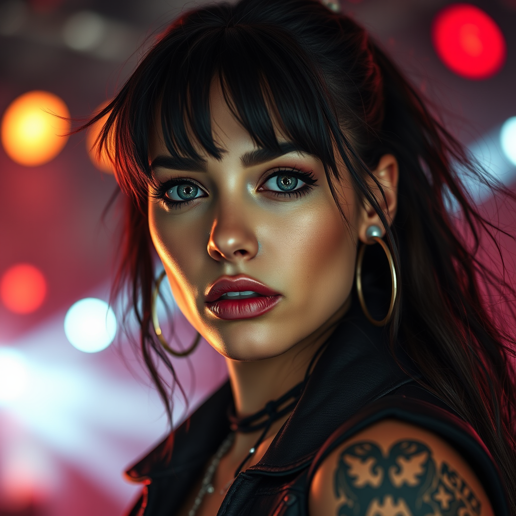 female rockstar portrait with a dynamic concert background, capturing a confident gaze towards the viewer. The image should radiate cinematic lighting with realistic details, highlighting her detailed skin texture and carefully crafted piercings. Achieve a photo-realistic quality with an 8k resolution, maintaining a full-length frame and sharp focus enhanced by diffused soft lighting. Ensure a shallow depth of field for a compelling composition. Emphasize high detail in the RAW art, employing hyperrealism and CGI techniques for a striking visual narrative. Avoid elements such as low quality, distortions, errors, or flaws like jpeg artifacts, extra limbs, or incorrect anatomy, ensuring clarity and precision without distractions or imperfections.