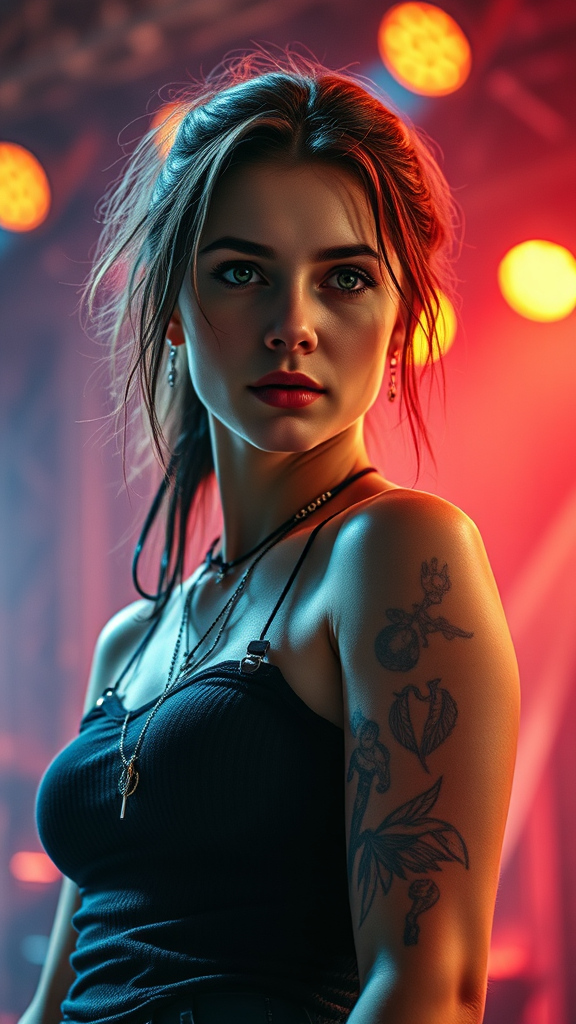 Female rockstar standing confidently with a concert scene in the background, gazing directly at the viewer. The portrait captures her striking features with detailed skin texture, set against a backdrop of vibrant stage lights. The photography-style image is highly realistic, rendered in 8k resolution with a full-length frame. The high detail in RAW color art highlights her character, with subtle piercings adding to her edgy persona. Diffused soft lighting and a shallow depth of field create a sharp focus on her dynamic presence, achieving a hyperrealistic effect. The cinematic CGI lighting adds a 3D dimension, enveloping her in a surreal concert atmosphere.