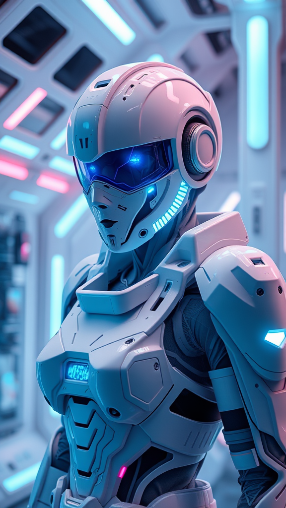 female sci-fi cyborg with white military armor, intricate helmet and mask, enhanced Teflon shell, cyberpunk theme, neon blue and radiant blue highlights, situated in a futuristic white technical chamber, set against a backdrop of energy beams and neon lights, rendered with 3D technology using Blender, features ray tracing with utmost quality and detail akin to a high-end fantasy movie, volumetric lighting effects, bokeh and long exposure techniques in 8K HDR rendering, geometric elements like triangles, hexagons, and flexible polyhedrons, enveloped in mist and plasma effects, no depiction of face, hair, or clothing elements