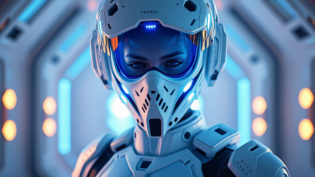 female sci-fi white military cyborg, intricate helmet, elaborate mask, sleek white Teflon exoskeleton, cyberpunk theme, vibrant neon blue highlights, luminous blue ray, futuristic white technical chamber setting, lively blue energy beams, vivid blue neon illumination, 3D rendering with Blender, implemented ray tracing, ultra-high quality and detail, designed in fantasy movie aesthetic, atmospheric volume lighting, Bokeh effect, intentional Long Exposure, 8K resolution, HDR visuals, triangular and hexagonal motifs, adaptable geometric polyhedron shapes, utilizing Teflon, ambient mist, dynamic plasma elements, omitting facial features, hair, fabric, and traditional clothing