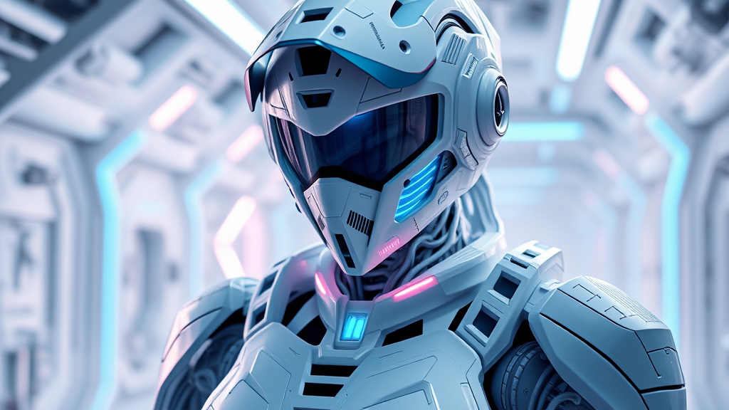 Female sci-fi white military cyborg with intricate armor, featuring a detailed helmet and mask crafted from sleek Teflon material. The armor reflects an ultra-modern cyberpunk aesthetic with neon blue highlights and glowing accents. Set in a futuristic white technical room, illuminated by a dynamic interplay of blue energy beams and neon lights. Rendered in stunning 8K resolution with HDR, capturing a cinematic atmosphere complemented by volume lighting and Bokeh effects. Showcasing a high level of detail with ray tracing, utilize geometric shapes like triangles, hexagons, and flexible polyhedrons in the design. The environment is infused with mist and plasma elements, enhancing the fantasy movie style ambiance. Avoid showing face, hair, and fabric to maintain a robotic focus.
