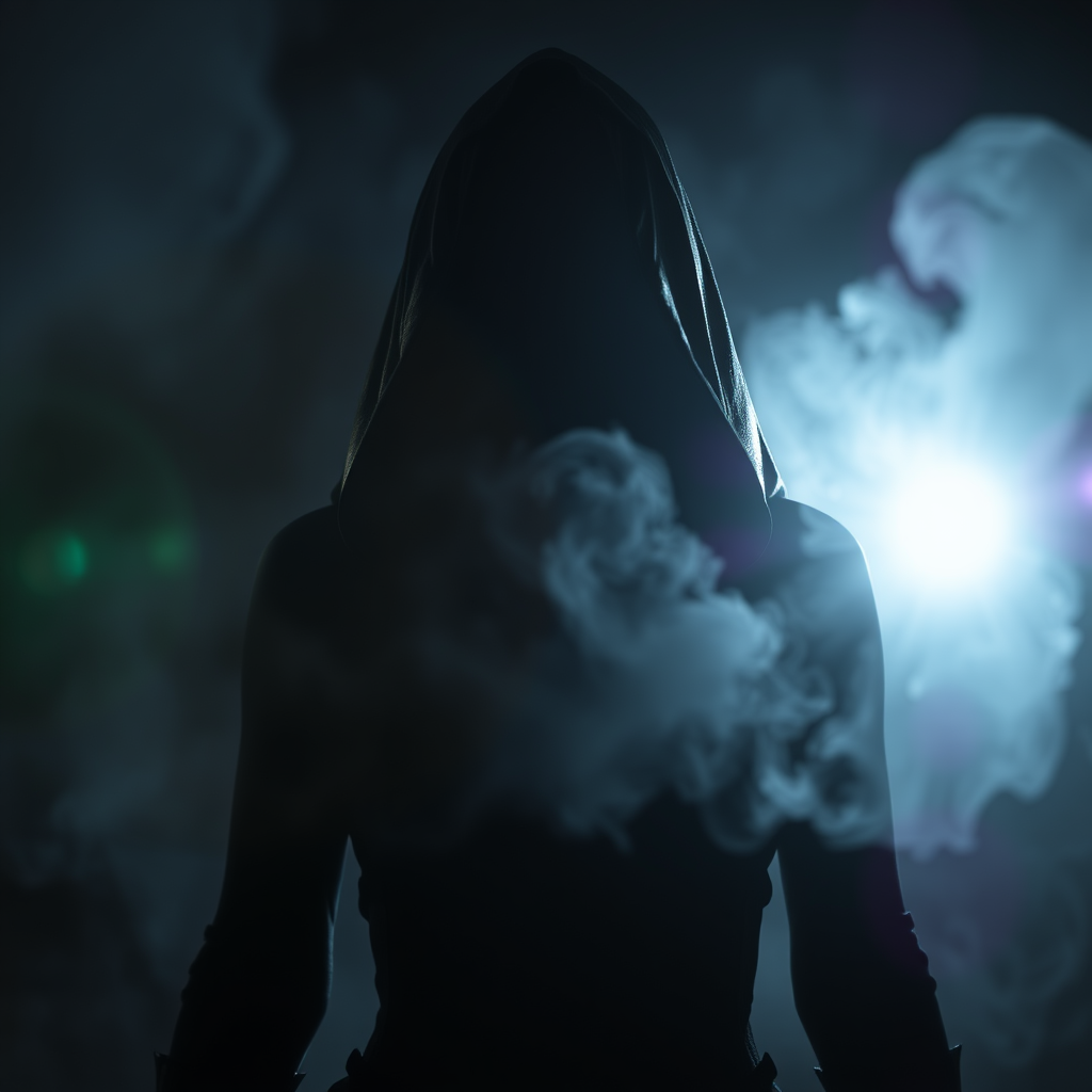 Female shadow assassin, central composition, enveloped in dark smoke, subtle dark vignette, soft bokeh effect, hints of lens flare, gentle light bloom, backlit with bright cinematic lighting, intricate depth of field, HDR rendering, ultra high-detail, heightened saturation, visible watermark, fragmented form, surreal missing limbs effect, mysterious and ethereal atmosphere.