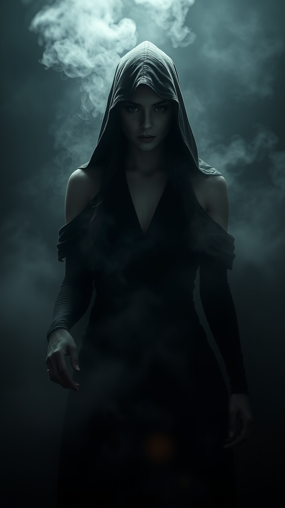 Female shadow assassin, standing centered shrouded in dark smoke, surrounded by a mild dark vignette with bokeh and lens flare effects, enhanced by light bloom with bright backlight cinematic lighting, displaying dramatic depth of field with HDR and ultra high-detail. High saturation accentuates her mysterious presence. The image features intentional imperfections like worst quality, low quality, normal quality, and bad quality elements. There is an artistic watermark subtly placed, and the depiction includes creative abstractions like missing arms and missing hands, contributing to the enigmatic atmosphere.