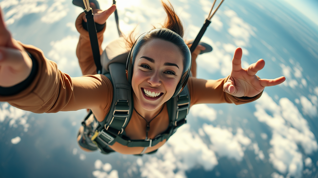 Female skydiver, leaping from aircraft, beaming smile, capturing selfie, dynamic motion, complete figure visible, intricate skin details, ultra-realistic, 8k resolution, superb detail, entire frame covered, high-definition RAW color imagery, diffuse soft lighting, shallow depth of field for enhanced focus, sharp clarity, hyperrealistic, cinematic light effects, CGI elements, avoiding low-resolution, image errors, cropped views, and maintaining high quality without artifacts, ensuring pleasing aesthetics, correct anatomy, and natural proportions without distortions, avoiding unnecessary duplications or deformations for a lifelike depiction without distractions like usernames or watermarks.