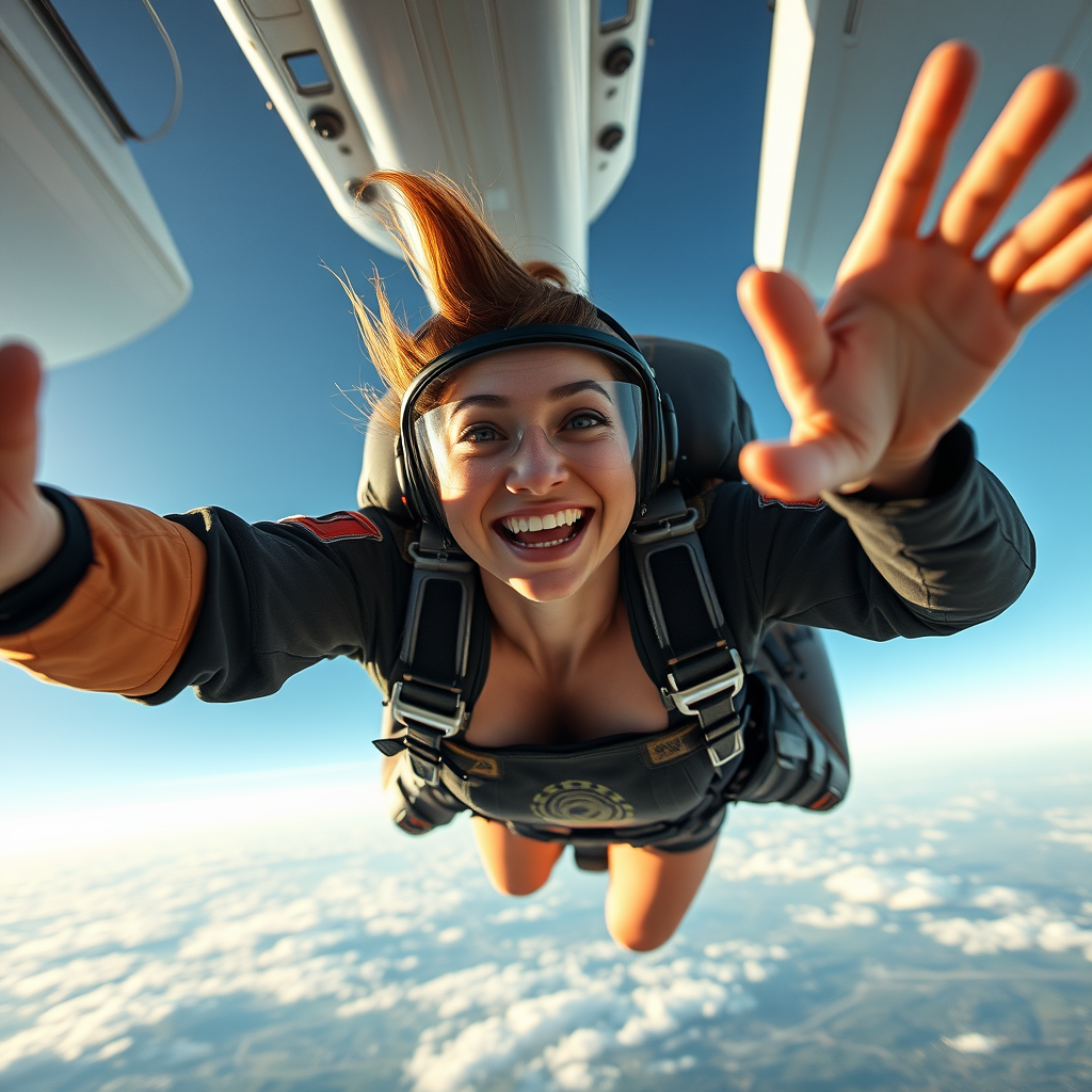 female skydiver, leaping from aircraft, beaming smile, capturing selfie, in motion, entire figure visible, intricate skin detail, highly realistic, ultra-high definition, full-length shot, RAW color art with high detail, soft and diffused lighting, shallow depth of field, sharp clarity, hyperrealistic style, cinematic lighting, digital rendering, 3D visualization, avoid low resolution, exclude text and errors, maintain high quality, avoid artifacts, depict beauty and realism, avoid duplicates or distortions, ensure correct anatomy and proportions, include no extra or missing body parts, adhere to realism in depiction, exclude any signatures or watermarks.