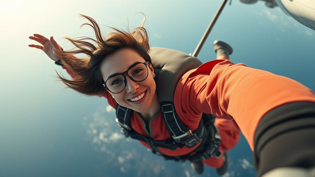 female skydiver, leaping from aircraft, cheerful expression, capturing selfie, in motion, entire body in view, detailed skin texture, lifelike, hyper-realistic, ultra-high-resolution, meticulously detailed, full-length composition, High detail RAW color art, diffused gentle lighting, shallow focus, crisp clarity, cinematic illumination rz-neg-15-foranalog, CGI, 3D, enhanced resolution, vibrant colors, graceful, dynamic pose, adventure, excitement, thrill, clear sky background, gravity defying, capturing the moment, lightweight gear, wind-swept hair, aerodynamic, exhilarating experience, capturing emotions, freedom, expansive horizon, adrenaline rush, adventurous spirit.
