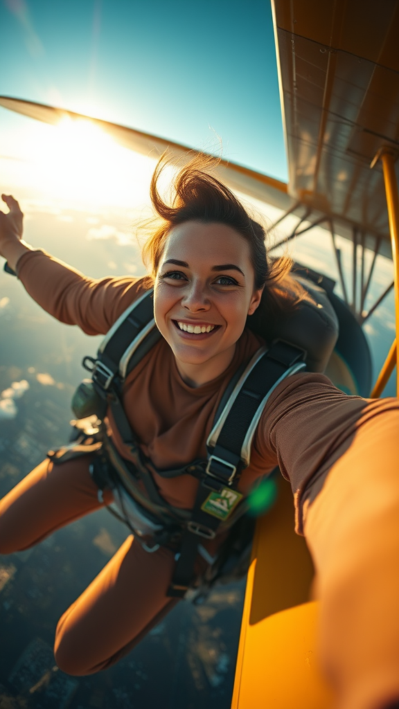 Female skydiver, plummeting from a vintage biplane, radiant smile, selfie mid-descent, dynamic motion, full body exposed, intricately detailed skin, photo-realistic texture, immersive, 4K-resolution, meticulously crafted, environmental portrait, subtle focus shift, luminous color palette, soft diffused light, gentle lens flare, heightened realism, cinematic atmosphere, richly detailed texture, user-profile information, mystifying aspect ratio, out-of-place comic sans font, wilderness, disparities, puzzled, jarring, flawed, ill-proportioned, symptomatically, orienting, platitude, angular jawline, betraying glance, scintillating patch of radiant light, contextless, snow-tattered, unconscious glare, predilections.