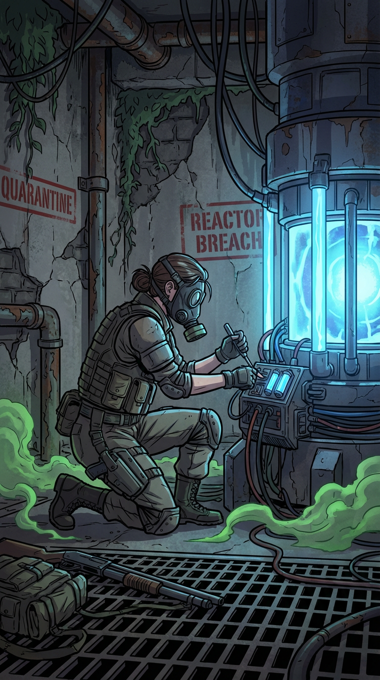A determined female soldier in a gas mask kneels to disarm a glowing reactor amidst toxic green gas in a crumbling sci-fi bunker. The scene is filled with dramatic lighting and a sense of urgent danger, rendered in a bold comic book art style.