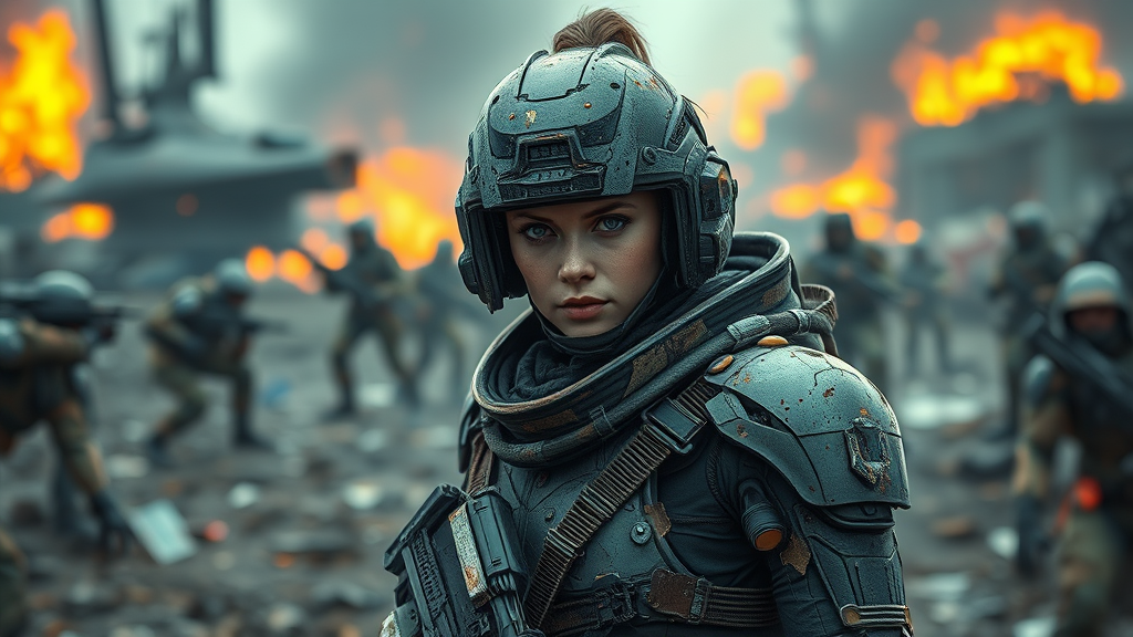 female soldier in damaged futuristic combat armor, apocalyptic war scene in background, facing viewer, photography, detailed skin, hyper-realistic, high resolution, intricate details, full body shot, vibrant colors, diffused soft lighting, shallow depth of field, sharp focus, cinematic lighting, CGI elements.