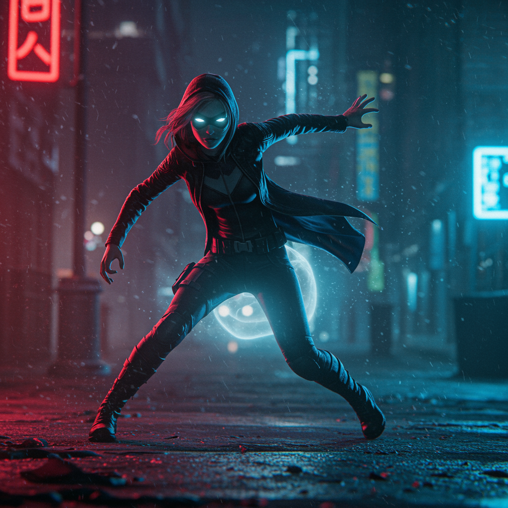 A young female superhero, embodying the enigmatic allure of a will-o'-the-wisp, prowls through a shadowy, dystopian city. The atmosphere is thick with tension, inspired by the gritty style of Frank Miller. Neon lights cast atmospheric glows on rain-soaked pavements as she strikes a dynamic action pose, her silhouette sharply contrasting against the dark urban backdrop, showcasing her fierce determination and otherworldly presence amidst the city's bleakness.