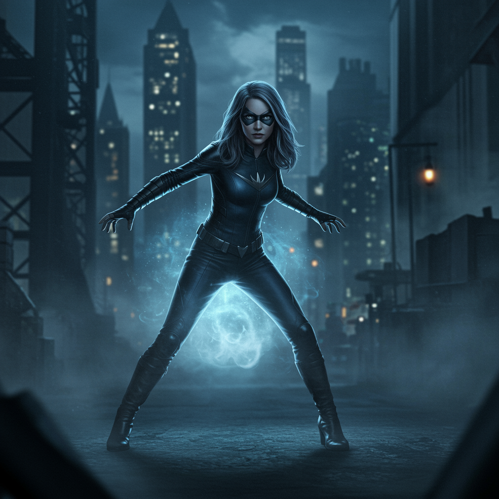 A young female superhero with a mysterious, ethereal presence reminiscent of a will-o'-the-wisp, navigating a shadowy, Frank Miller-inspired cityscape. She stands poised in an action stance, the atmosphere thick with mist and dramatic chiaroscuro lighting highlighting her silhouette. Her figure is a striking contrast against the dark urban backdrop, embodying both elegance and strength in a world shrouded in secrecy and intrigue.