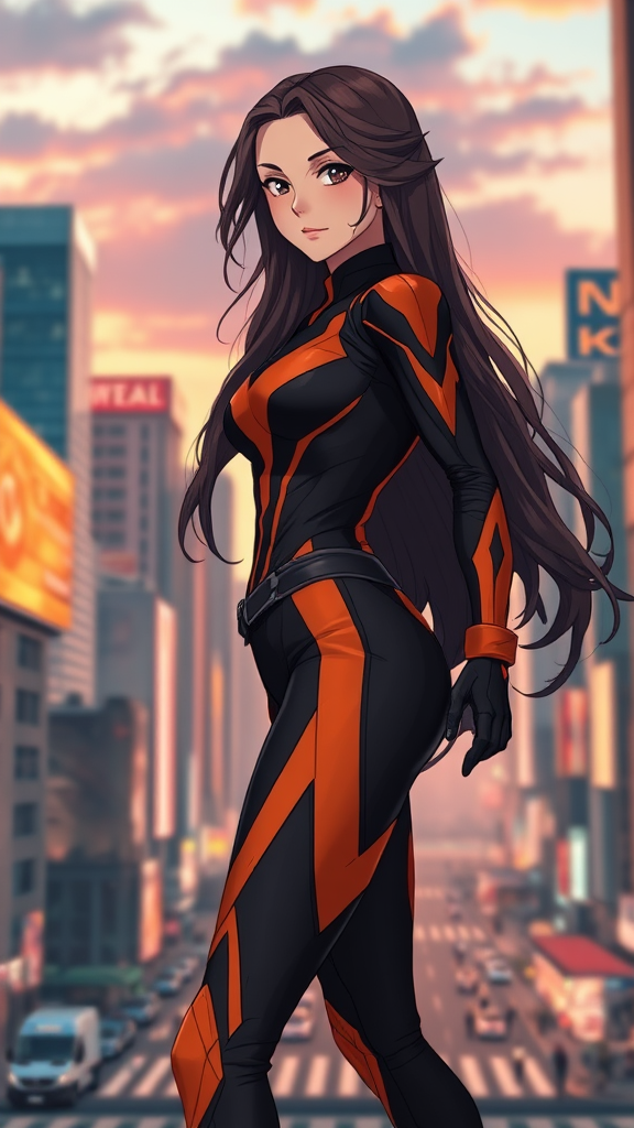 Female superhero standing in a bustling cityscape at dusk, long wavy hair cascading down her back, dressed in a sleek black and orange suit. Her dynamic pose exudes confidence and power, captured in ultra-high definition 8k with sharp, clean focus. The scene is illuminated with volumetric lighting, casting soft shadows around her. The artistic style is reminiscent of cinematic anime, blending the vibrant energy of Studio Trigger with the serene beauty of Makoto Shinkai's work, and the whimsical charm of Studio Ghibli and Miyazaki. This image is free from errors or anomalies such as extra or missing limbs, disfigurements, or distractions like text, signatures, and watermarks. The quality is impeccable, ensuring a captivating and seamless visual experience.