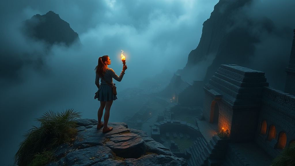 Female treasure hunter standing at the edge of a mist-shrouded mountain, torch in hand glowing with an otherworldly light, illuminating a path behind her that winds through ancient ruins, the camera positioned to capture the sweeping curves of the city's architecture as she descends into the lost metropolis, dramatic lighting casting long shadows across the stones, vignettes of exotic flora and crumbling artifacts peeking through the undergrowth as she reveals secrets hidden for centuries.