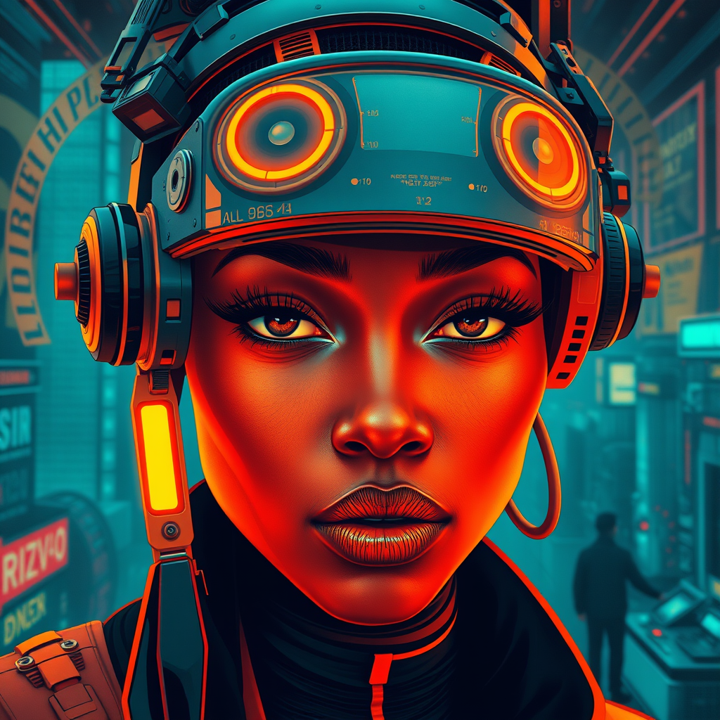 female visage in afrofuturism style reminiscent of george callaghan, fused with elements of engineering and architectural design, urban life scenes, set in dark cyan and vibrant orange hues, poster art aesthetics, ultra high definition 32k details, panoramic aspect ratio 1:2, with a creative touch of stylized imagination subtle yet immersive in nature