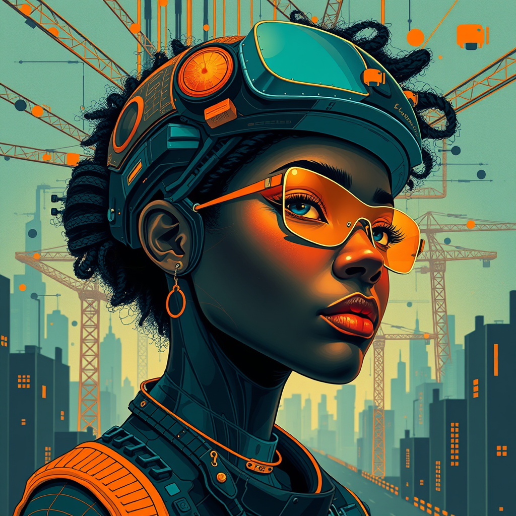 Female visage in the essence of afrofuturism, inspired by the artistry of George Callaghan, entwined with themes of engineering, construction, and design. This poster art captures vibrant urban life, blending dark cyan and orange hues, depicted in ultra-high-definition. The artwork is elongated, emphasizing a portrait orientation that harmonizes with imaginative tributaries, infusing the environment with dynamic patterns and futuristic elements, encapsulating a vision of innovation and culture.