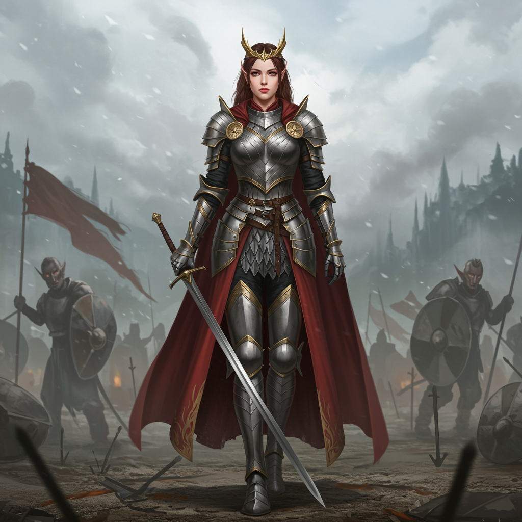 A stunning female warrior standing proudly on a battlefield, her strikingly beautiful face exuding strength and grace. The scene is a masterful piece of fantasy art, with intricate details capturing the essence of an epic, mythical world. The artwork boasts smooth and clear focus, bringing the concept art to life with precision and depth. The warrior's armor and attire are elaborately designed, enhancing her regal presence. The background hints at the remnants of a fierce battle, adding drama and emotion to the scene while maintaining a sense of elegance and poise.