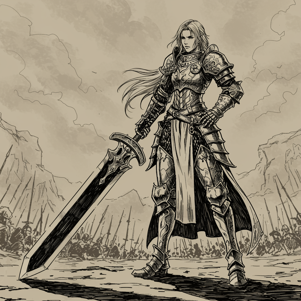 A powerful female warrior stands poised with an imposing greatsword, rendered in an intricate, Final Fantasy-inspired ink style. The scene is bathed in dramatic lighting that casts dynamic shadows, highlighting her fierce determination. The wide-angle perspective captures the full grandeur of her stance, accentuating the swirling folds of her armor and the elaborate details of her weapon. The setting is an epic landscape, blending fantasy elements with a sense of timeless battle, presented in stunning 4k resolution, emphasizing the warrior’s commanding presence amidst the vastness.