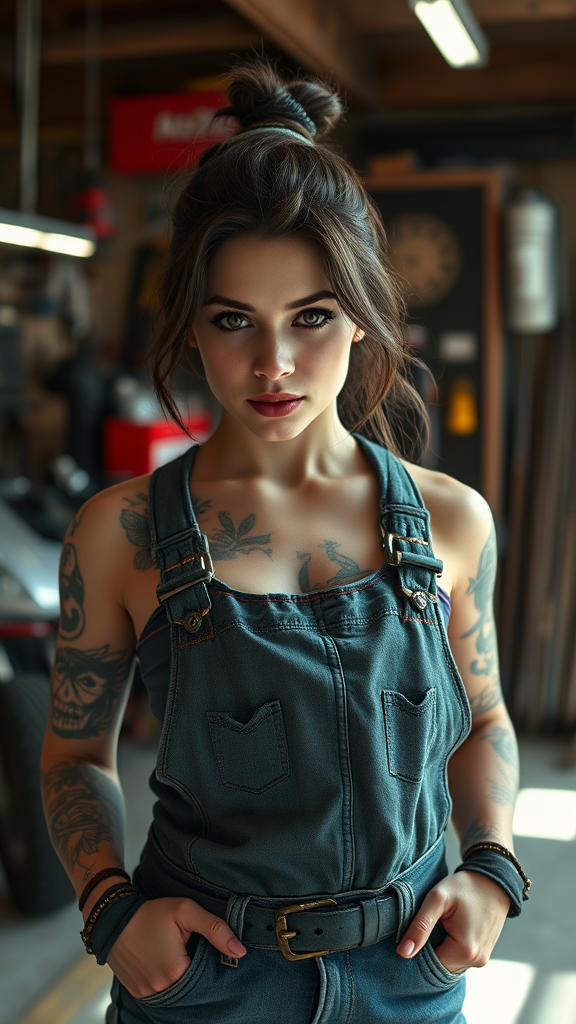 Female wearing a mechanic's outfit in a workshop setting, face clearly visible, dressed in jeans with visible tattoos, engaging directly with the viewer. Capture the scene as a portrait photography with detailed and realistic skin textures. Achieve a photo-realistic style in 8k resolution, focusing on high detail and raw color. The image should be full length with piercing and utilize diffused soft lighting. Aim for a shallow depth of field and sharp focus to enhance hyperrealism. Employ cinematic lighting to elevate the visual. Avoid low-resolution elements, text, errors, cropping, and artifacts such as duplicates, morphed or mutated features, blurriness, and unfavorable anatomy like extra or missing limbs and deformations.