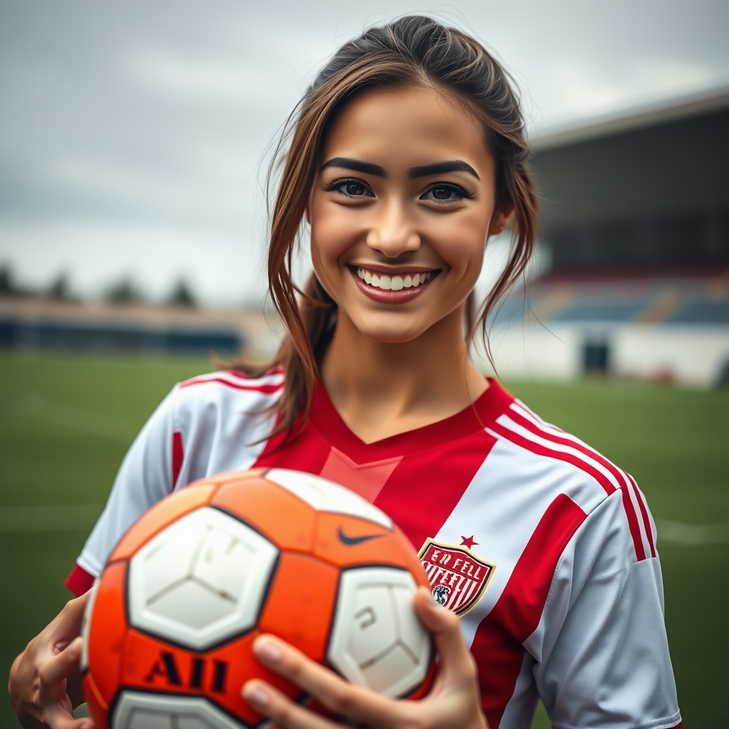 Female wearing a soccer player's outfit, holding a soccer ball, smiling confidently, with a football pitch in the background. She has a playful look, making direct eye contact with the viewer, captured in a portrait style. The photography highlights detailed skin textures and a photo-realistic appearance, using 8k resolution for a highly detailed, full-length frame. The colors are rich and raw with diffused soft lighting creating a cinematic atmosphere. The shallow depth of field ensures a sharp focus on her features, emphasizing hyperrealism with softly blurred surroundings. The image maintains high quality, avoiding low-resolution artifacts and imperfections like blurriness or disproportionate features. Her natural pose and expression exude confidence and charm, without artificial elements such as watermarks or overlays.